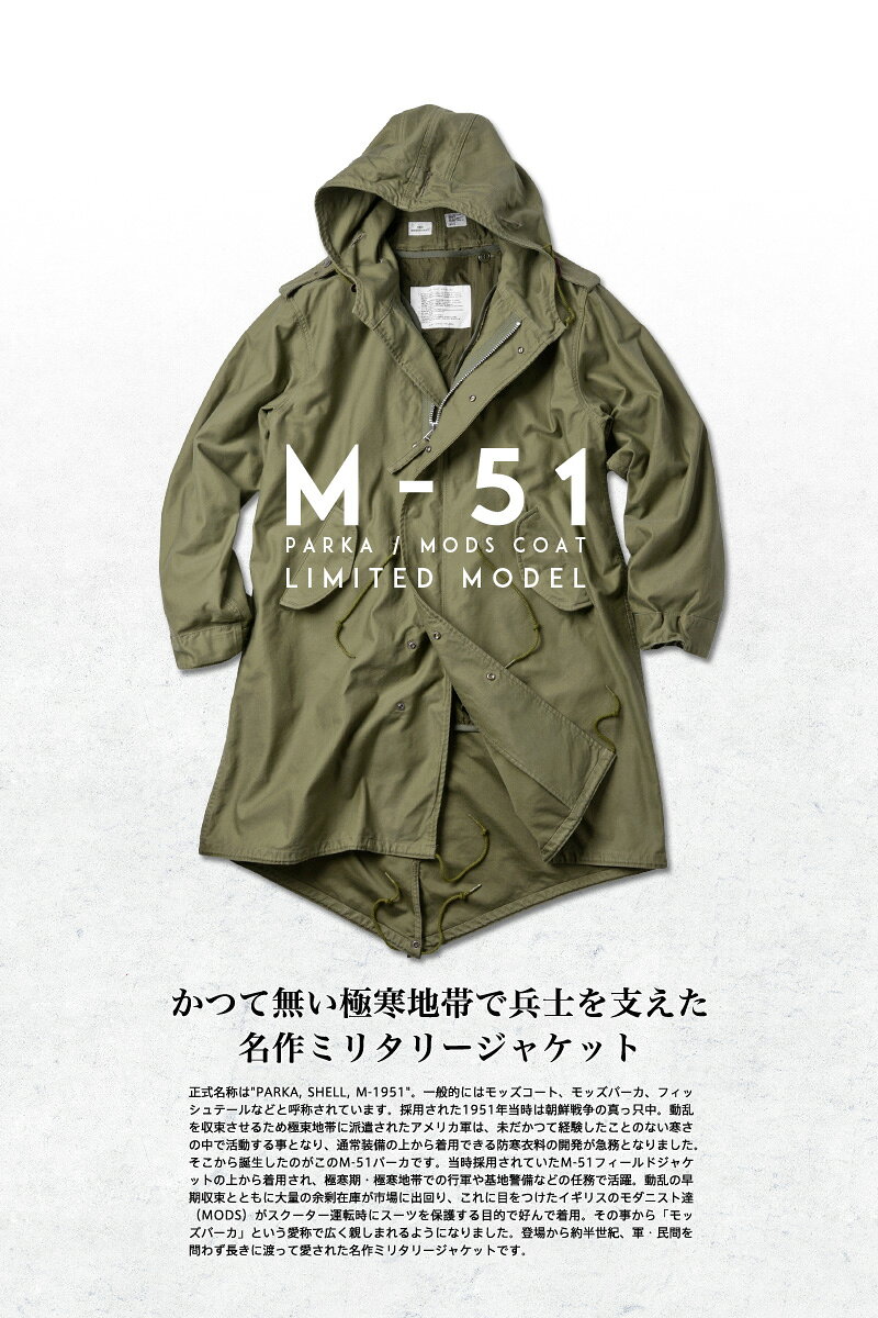 一般的にはモッズコート・モッズパーカ・フィッシュテールなどと呼称されており、1951年にアメリカ軍の寒冷地用衣料として採用されたモデルとされています。